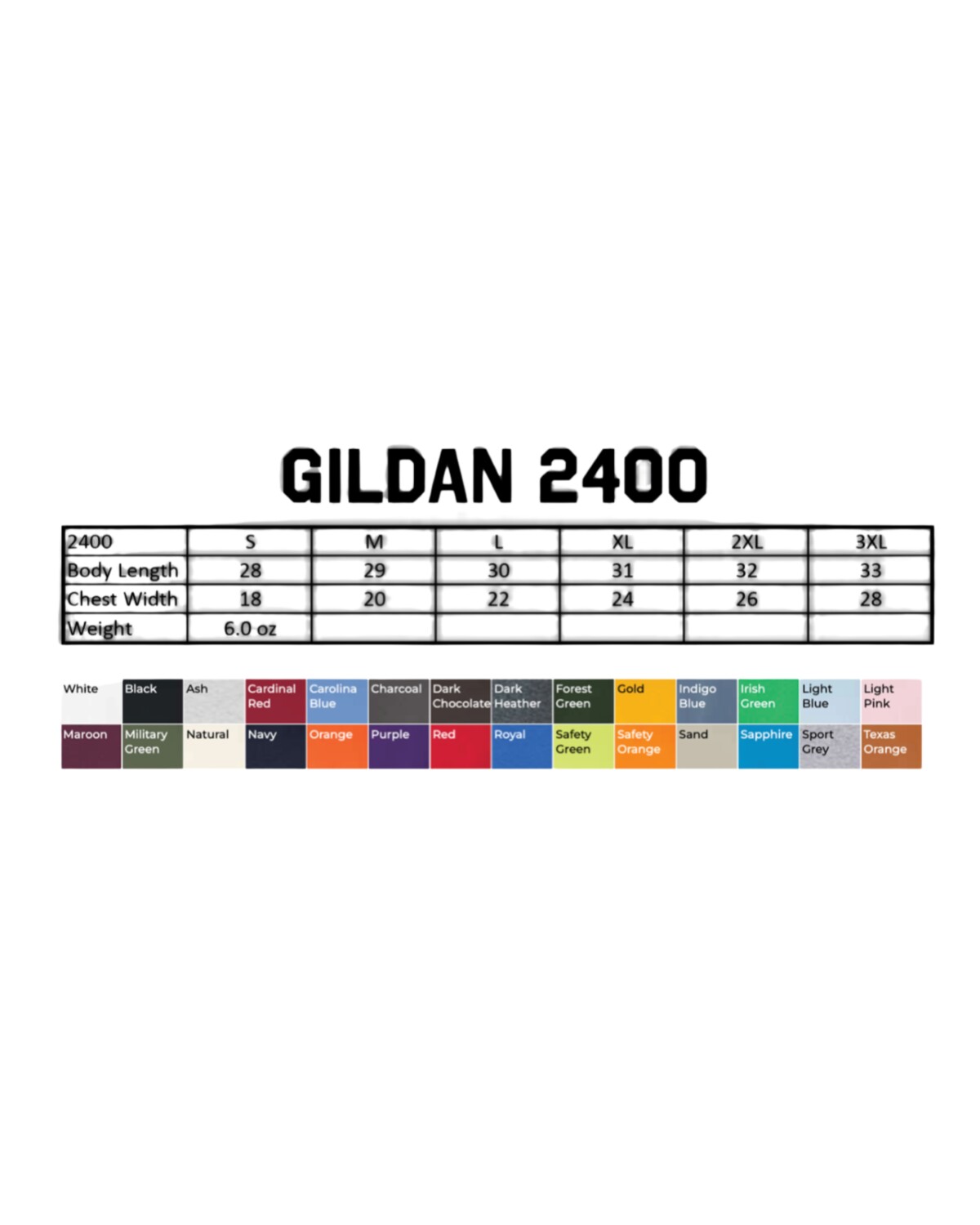 Printed on Gildan 2400. See image for sizing.